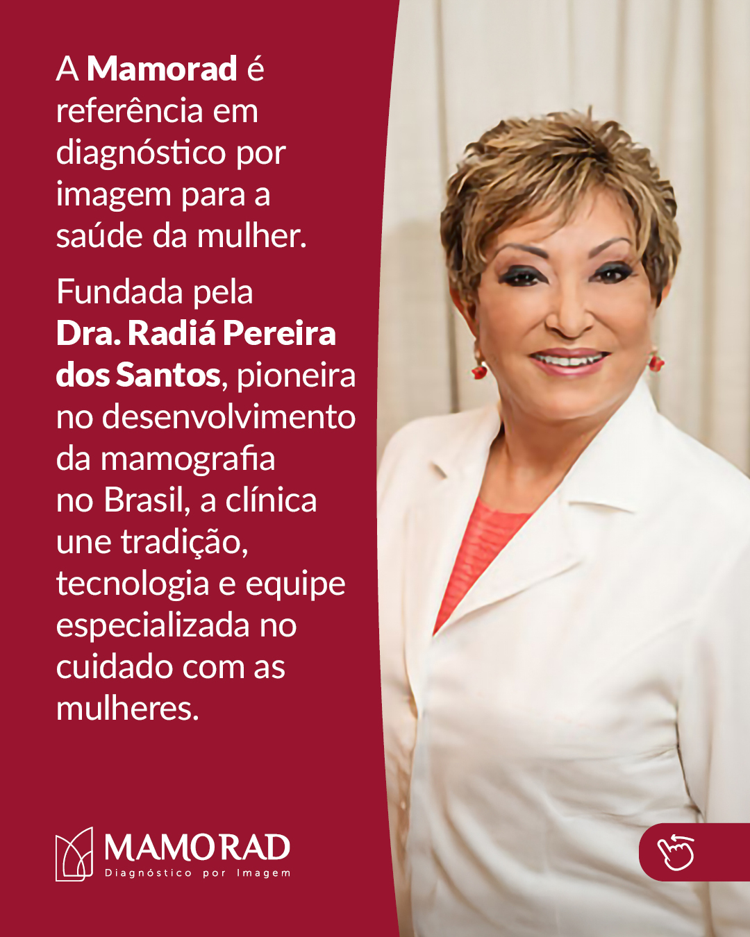 A Mamorad, fundada pela Dra. Radiá Pereira dos Santos — referência e pioneira no desenvolvimento da mamografia no Brasil —, alia tradição, tecnologia e excelência diagnóstica no atendimento às pacientes.